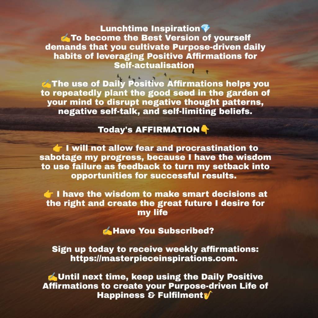 ✍️This brings me to my final point; to become the Best Version of yourself demands that you must first cultivate intentional daily habits of Purpose-driven Personal Transformation. And that includes leveraging your Daily Positive Affirmations to overcome negative thinking and self-talk, limiting beliefs and all forms of self-sabotage.