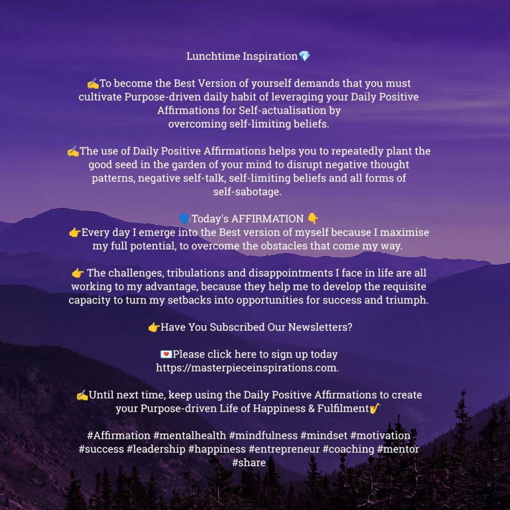 ✍️This brings me to my final point; to become the Best Version of yourself demands that you must first cultivate intentional daily habits of Purpose-driven Personal Transformation. And that includes leveraging your Daily Positive Affirmations to overcome negative thinking and self-talk, limiting beliefs and all forms of self-sabotage.